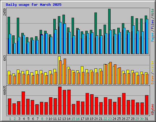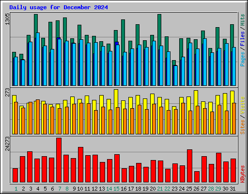 | Day | Hits | Files | Pages | Visits | Sites | KBytes | ||||||